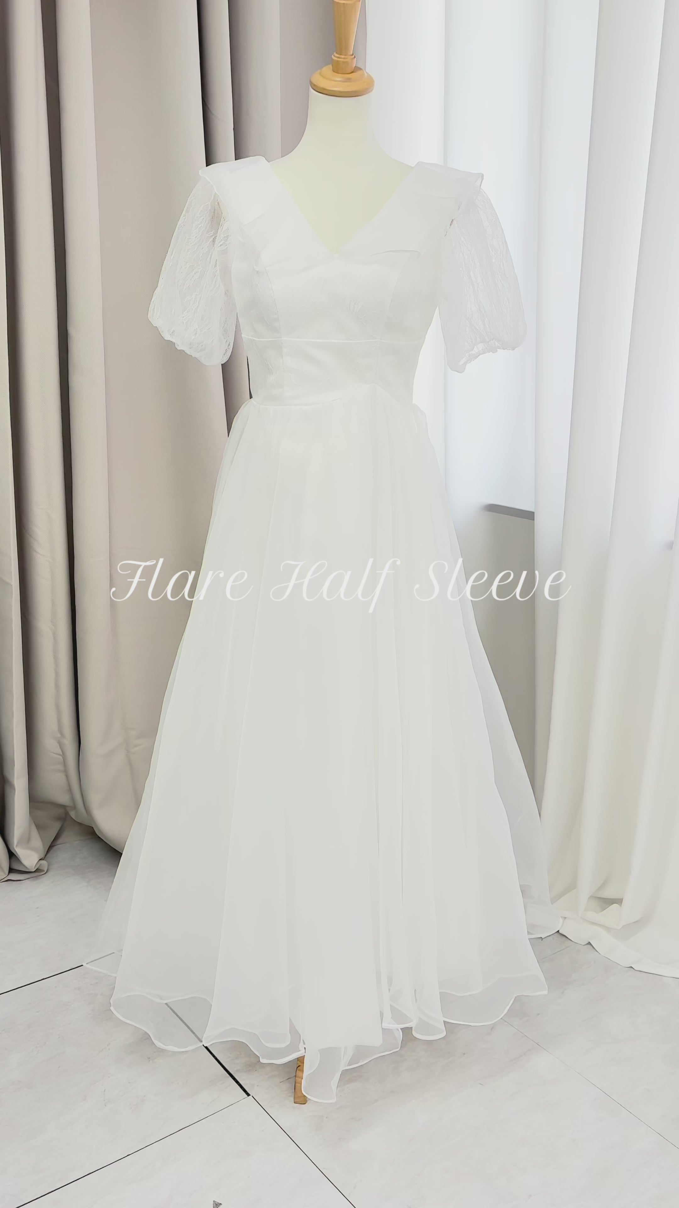 丸みを帯びた、半袖も可愛らしさを引き立てるウェディングドレスです。